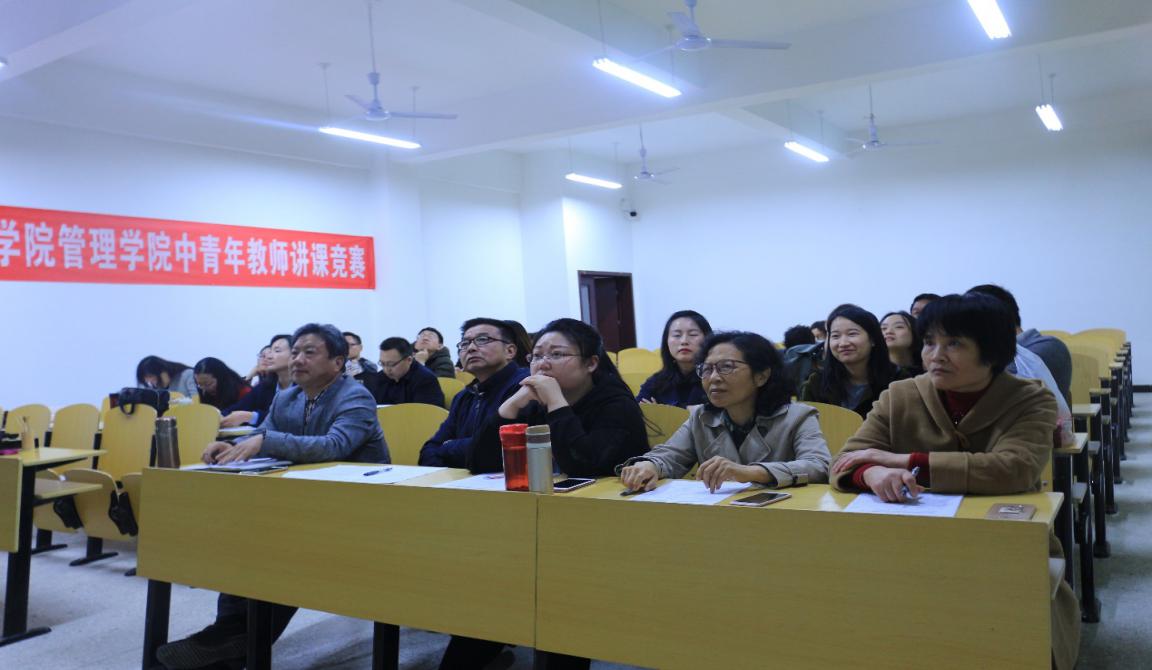 2019年4月10日星期三下午2点,管理学院在5号教学楼122教室举行了中青年教师讲课竞赛。出席本次讲课竞赛的评委嘉宾有管理学院院长黄金火教授、旅游管理系张新教授、财务管理系郭德松副教授、财务管理系吴远丽副教授、工商管理系刘丹副教授,本次竞赛由管理学院副院长刘炫老师主持,管理学院全体教师共同参加。