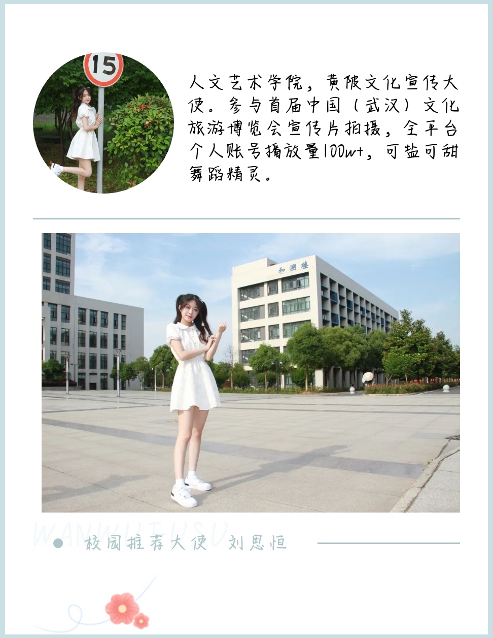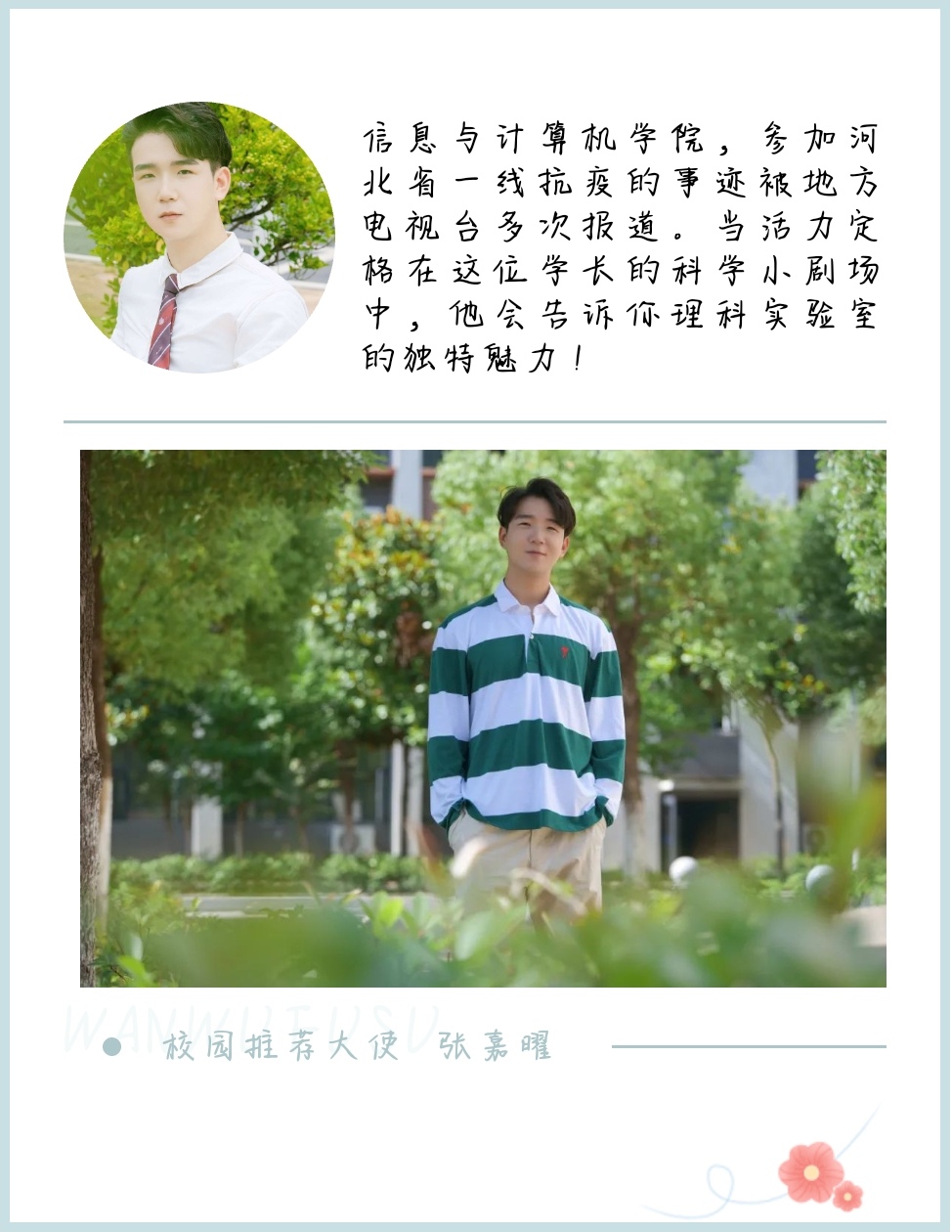今年招生毕业季来临之际,为全方位展示武汉文理学院的校园风貌和教学设施,经校团委和各学院推荐,宣传部遴选出了10名校园推荐官参与拍摄“2022年招生季青春校园”系列宣传片,并在官方微信、微博、抖音、网站等平台同步推出。