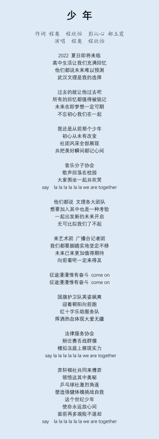 武汉文理学院首支校园文化宣传MV《少年》由党委宣传部和校团委共同策划,拍摄、制作历时一个月,邀请大学生艺术团知名校园歌手程奥、程欣怡倾情演唱。