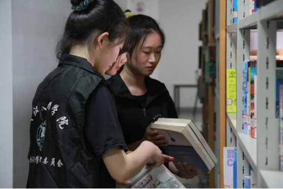 图书馆内还经常能看到图书馆学生管理委员会的同学们,他们由具有共同兴趣、爱好、志向和责任感的同学组成,协助老师维护图书馆的正常运转,形成师生 “共建、共管”的新局面。