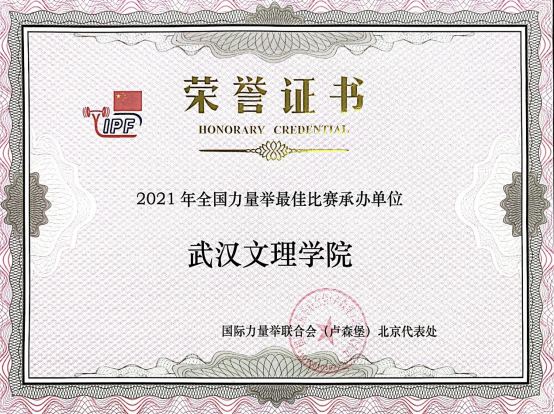 国际力量举联合会(卢森堡)北京代表处授予武汉文理学院“2021年全国力量举最佳比赛承办单位”荣誉称号