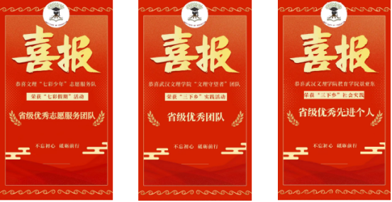 武汉文理学院“文理守望者”团队在省文明办、团省委、省教育厅、省乡村振兴局、省学联等单位联合举办的“三下乡”社会实践活动中,荣获省级优秀团队称号,其中景亚东同学荣获省级优秀先进个人称号。