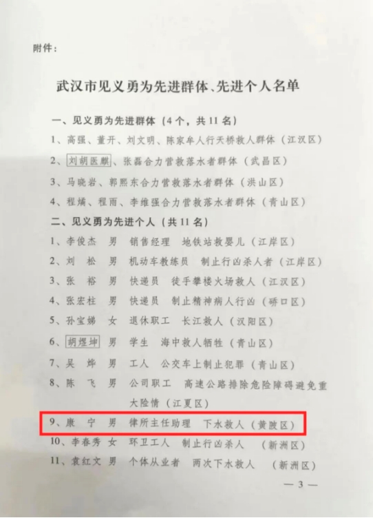 政法学院优秀校友康宁同志荣获2022年“武汉市见义勇为先进个人”称号。2021年8月24日晚康宁同志面对落水者临危不惧,挺身而出,跳入江中救起了轻生女子。他的见义勇为行为展现了当代大学生不畏艰难,舍己为人的崇高精神,为政法学院的其他学子树立了一个优秀的榜样,也极大的鼓舞了全体师生向榜样学习,我们当代青年应将见义勇为、热心助人的精神传递下去,营造一个学习、崇尚、关爱的校园氛围。