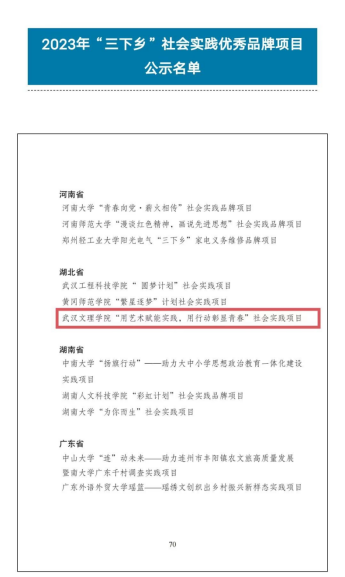 本次通报表扬“三下乡”社会实践优秀品牌项目共71个,湖北省优秀品牌项目共3个,其中之一就是我校人文艺术学院“用艺术赋能实践,用行动彰显青春”特色品牌项目。