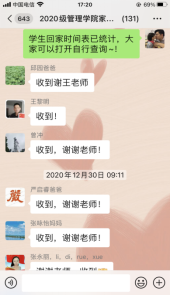在寒假来临之际,王超老师率先统计好各班每位同学的离校时间和离校去向,确定各班学生最后考试时间,将学生离校情况反馈给每一名家长,各位家长对王超老师在校对学生给予的帮助和照顾表示感谢,他也和各位家长进行一对一沟通,切实做到了一切为了学生,为了学生的一切。