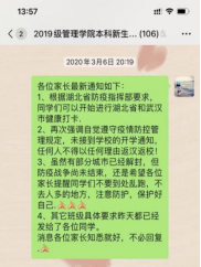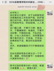 武汉文理学院管理学院本就一直坚持以家校联合育人为形式开展着学生工作。“静下心来和学生们在一起” “作为一名辅导员,我始终坚持‘学生事无小事’原则,从学生的角度出发,与学生平等对话,真心交流” 这是管理学院辅导员郑娟老师一直秉持着的工作态度。回望2020年新年伊始,新型冠状病毒感染的肺炎疫情的迅速蔓延,一场没有硝烟的战争悄然打响。作为管理学院19级学生辅导员的郑娟老师,244名学生的健康情况时时刻刻都在牵动着她的心。2020年3月6日,郑娟老师迅速召开19级学生家长会,在各个班级迅速展开排查,做好学生排查工作,对学生居住地址、身体状况登记汇总,各班实行“日报告”和“零报告”制度,所带班级的244名学生无一例感染疫情。