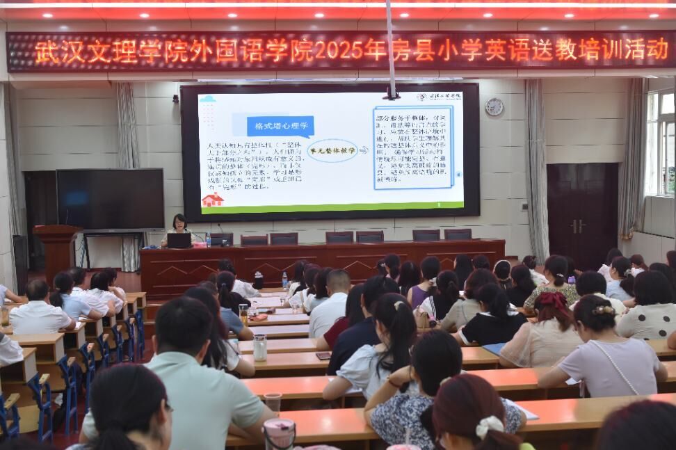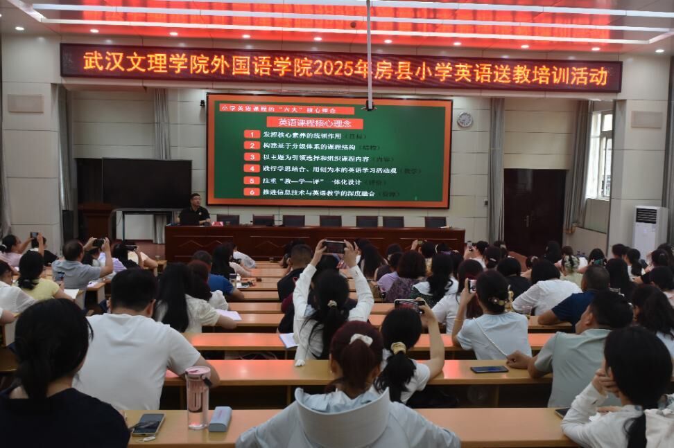 为持续推动城乡教育均衡发展,切实提升基层学校课堂教学质量,近日,武汉文理学院外国语学院组织骨干教师团队赴十堰房县实验小学,为当地百余名教师开展英语送教下乡培训专题活动。本次活动以“精准赋能、共促提升”为核心,通过专题讲座、示范课展示、互动研讨等多元形式,为两地教育工作者搭建了深度交流的专业平台,助力房县小学英语教学提质增效。