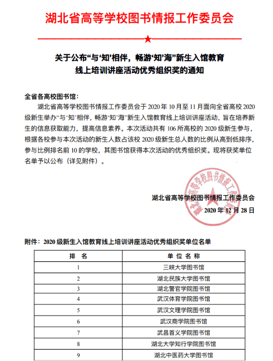 湖北省⾼等学校图书情报⼯作委员会于 2020年10⽉⾄ 11⽉⾯向全省⾼校 2020级新⽣举办“与‘知’相伴,畅游‘知’海”新⽣⼊馆教育线上培训讲座活动,旨在培养新⽣的信息获取能⼒,提⾼信息素养。
