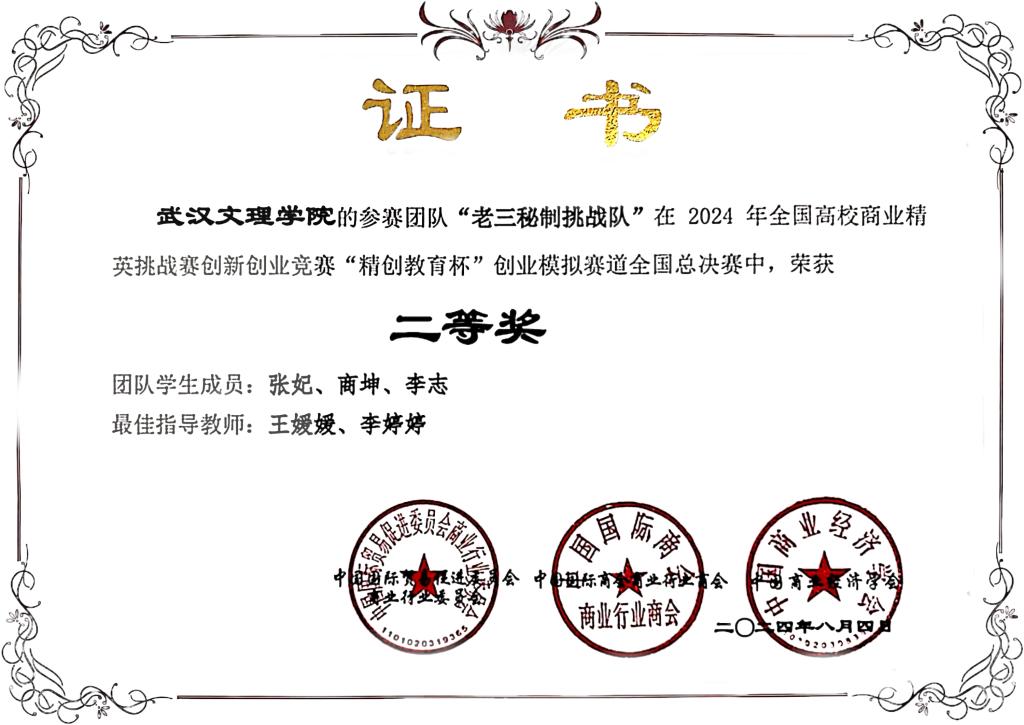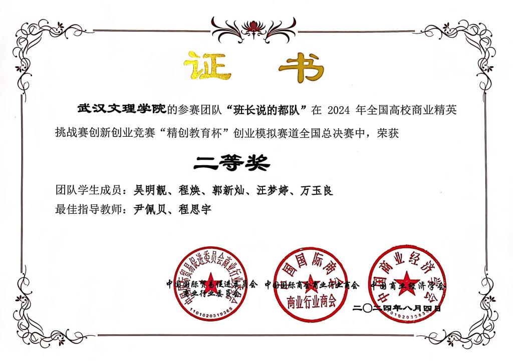 近日,2024年全国高校商业精英挑战赛创新创业竞赛“精创教育杯”创业模拟赛道全国总决赛落下帷幕,武汉文理学院4支参赛团队表现出色,喜获国家级二等奖3项,国家级三等奖1项的优异成绩。