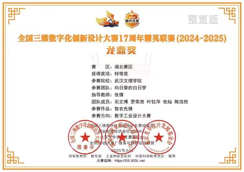 近日,全国三维数字化创新设计大赛17周年精英联赛(2024-2025)湖北赛区竞赛结果揭晓,武汉文理学院智能制造与无损检测学院学生荣获特等奖1项,二等奖1项。