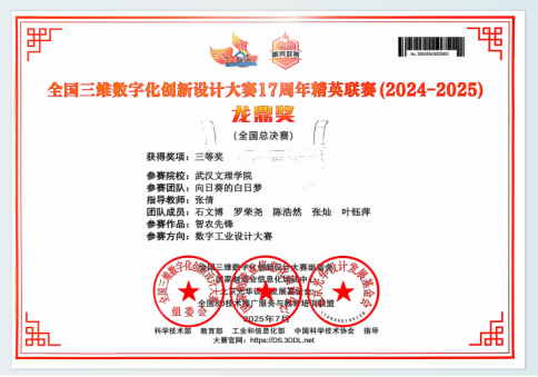 近日,“全国三维数字化创新设计大赛17周年精英联赛(2024-2025)”总决赛圆满落幕,获奖榜单重磅揭晓。武汉文理学院智能制造与无损检测学院“向日葵的白日梦队”凭借出色的创意设计、精湛的3D数字技术与工程实践能力,在激烈的竞争中脱颖而出,最终斩获全国总决赛三等奖。