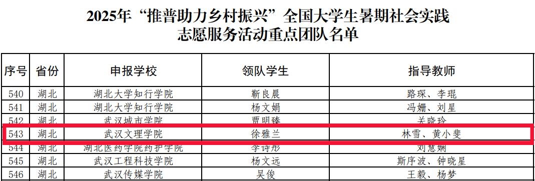 近日,教育部公布了2025年“推普助力乡村振兴”全国大学生暑期社会实践志愿服务活动入选团队名单。经专家审议,武汉文理学院赤商追光者志愿服务队从全国8013支团队脱颖而出,成功入选1000支全国重点团队之一,标志着学校在推动志愿服务深度融入乡村振兴国家战略的实践中,取得重要突破。