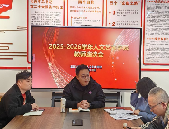 12月10日下午2点,武汉文理学院人文艺术学院在7-316会议室召开教师座谈会。学院院长吴聪、教学副院长严璇、学工办主任王超与全体教师齐聚一堂,围绕教学发展、工作保障、就业评估等议题深入交流,凝聚发展共识。