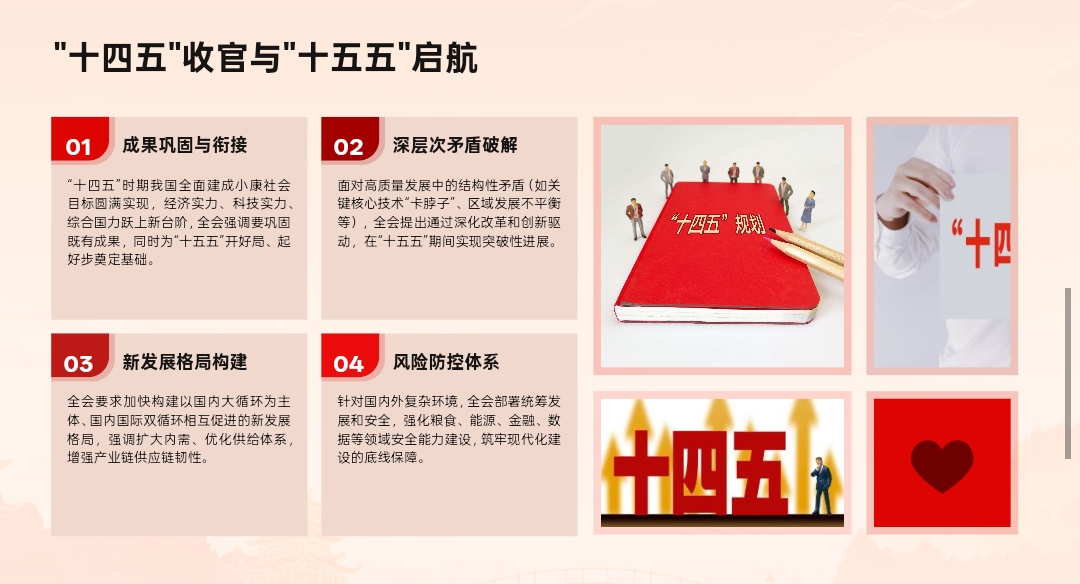 全会立足“两个大局”——中华民族伟大复兴战略全局和世界百年未有之大变局,系统回答了新时代新征程“干什么、怎么干”的重大问题,体现了党中央高瞻远瞩的战略谋划。全会通过的《建议》作为指导“十五五”时期经济社会发展的纲领性文件,明确了高质量发展的目标任务和政策框架,为各级党委政府提供了行动指南。