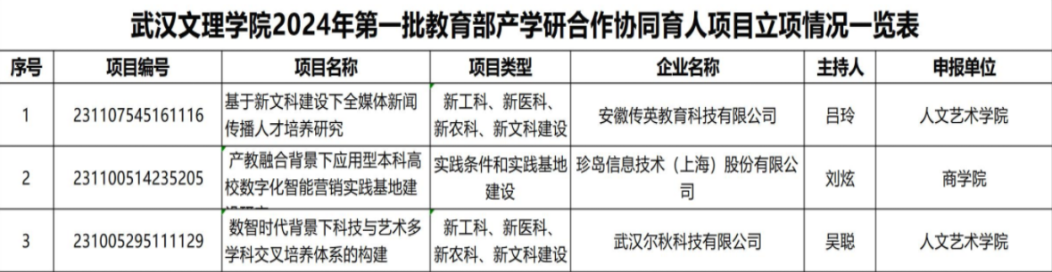 4月17日,教育部公布2024年第一批产学合作协同育人项目立项名单,武汉文理学院获批3项。