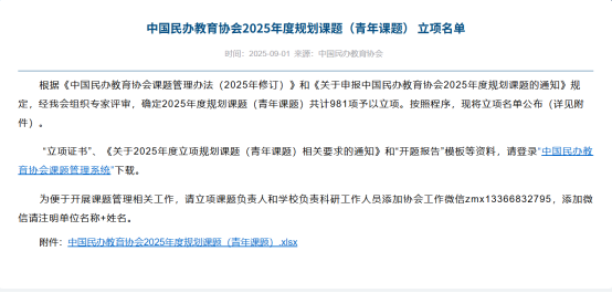 在此,特向获批立项的学院和教师个人表示热烈祝贺!学校将严格依据《中国民办教育协会课题管理办法(2025 年修订)》做好项目管理、监督与结题工作,同时提供必要资源支持,确保项目顺利实施并产出高质量成果,助力学校教育教学质量提升。
