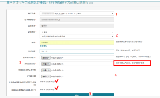 (3)上传非学历证书原件清晰的照片和身份证反面照片(需印有持证人照片、姓名等身份信息),勾选非学历证书对应的拟免考课程信息,如下图;