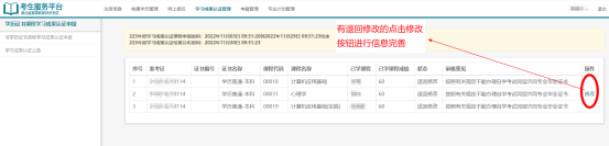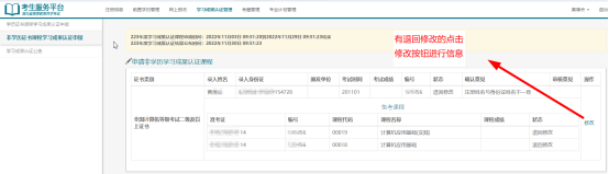 注意:考生提交非学历证书课程免考申请后,针对资料上传不全或信息录入错误的申请,考籍所在地网上确认时会将申请退回修改,同时会发送短信通知提醒考生,考生可登录考生服务平台,进入学习成果认证管理模块,查看课程免考办理信息,点击“修改”进入修改环节,如下图;
