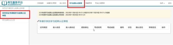 (1)进入学习成果认证管理,选择左侧学历证书课程学习成果认证申报页面,在申请时间内,点击申请学历学习成果认证课程按钮,进入申请页面,详细如下图;