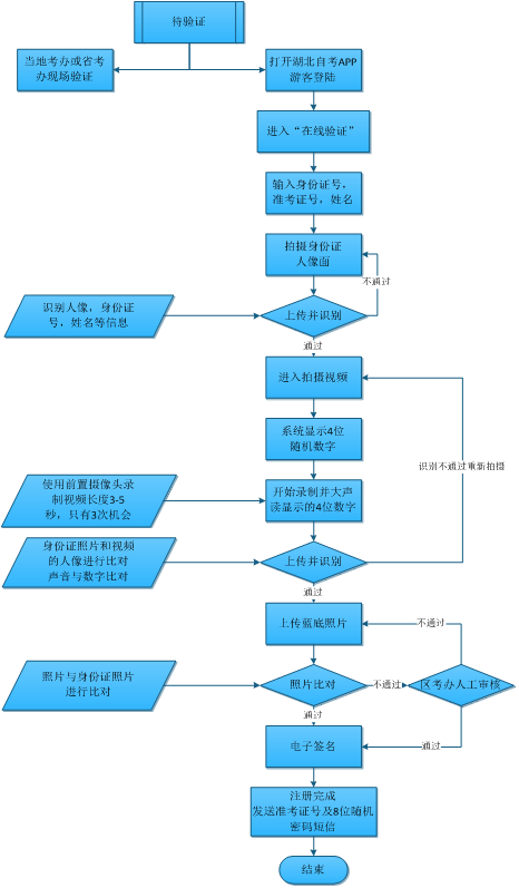 1.网上验证:考生可通过“湖北自考”APP按提示首先上传身份证反面照片(含头像和个人信息面),然后按照提示录制并上传清晰朗读数字的视频,完成人脸识别比对,最后上传电子证件照(免冠蓝底,480像素×640像素,分辨率300dpi,压缩后文件大小一般在20KB至40KB,文件扩展名应为JPG),系统自动与身份证比对验证身份。身份验证通过者,即可报考相关课程、缴纳相关考试费用;身份验证未通过者,需重新按要求进行身份验证,验证最多只有三次。网上验证不通过的考生,请进行现场确认。身份验证过程中上传的证件照将用于考试通知单打印、毕业证办理及其他业务,请严格按照要求,上传本人近期电子证件照,否则后果自负。