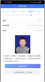 此时,考生可选择“重新验证”或“人工审核”,若选择上传电子照片人工审核,需重新选择上传蓝底照,待当地自考办人工审核,审核驳回需重新上传,审核通过则进行下一步,上传成功后,自动跳转到下一步。