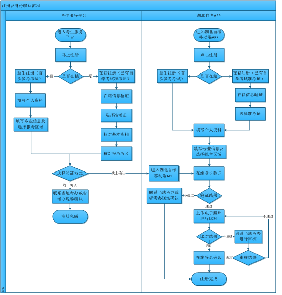 参加我省自学考试的考生请先在自学考试考生服务平台或者湖北自考APP完成注册。注册完成后方可报考。注册与身份确认流程图如下: