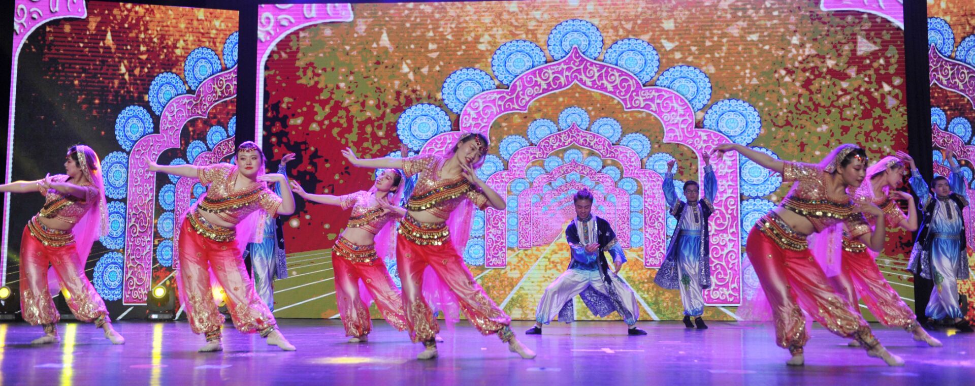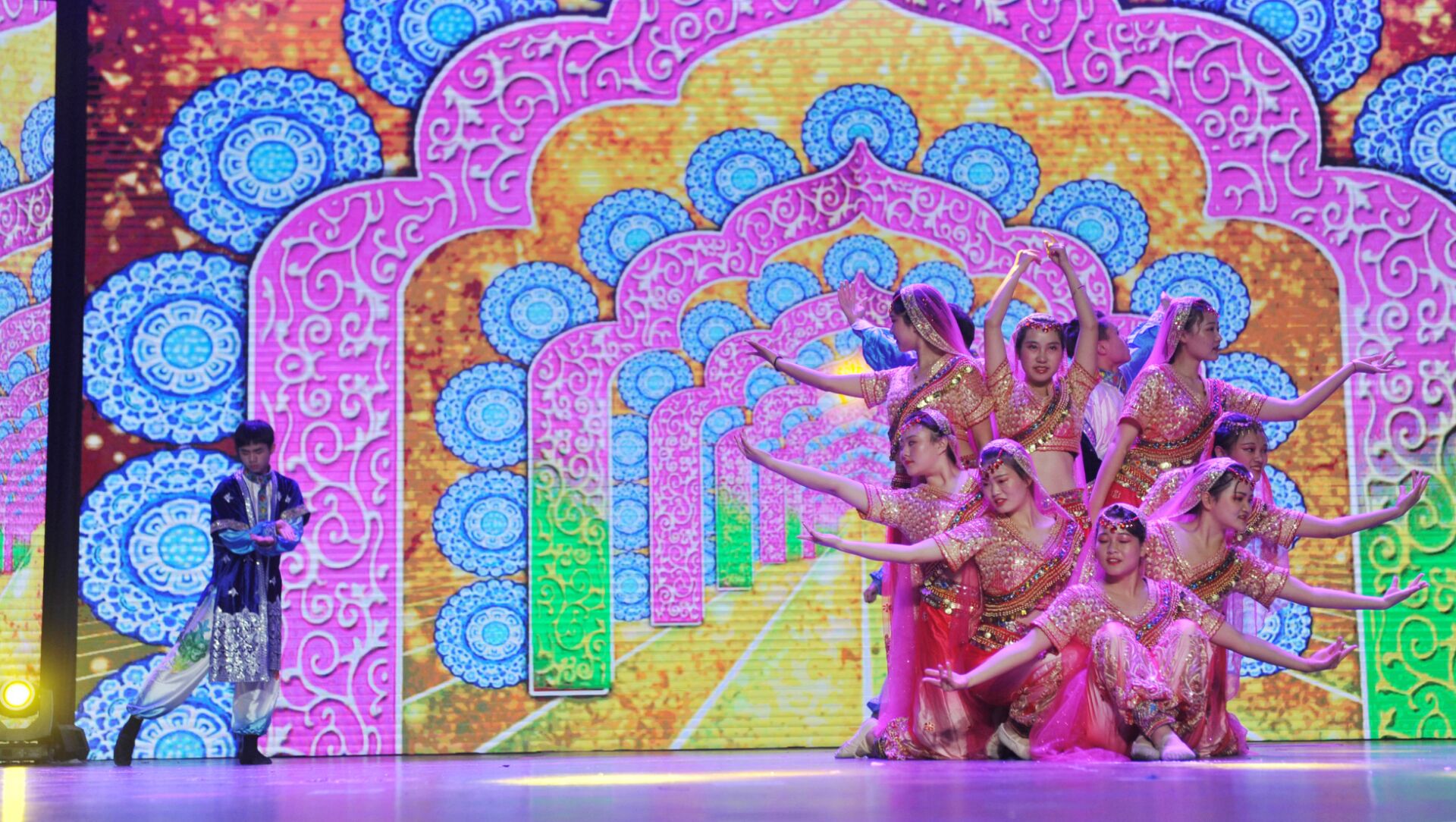 16号下午规定动作舞蹈《丝绸之路》上场。红色金片铃铛露脐和金色头纱红宝石挂饰,蓝绸缎长褂,梵文绣花腰带,充满异域风情打扮一上场就夺得了台下观众的眼球。