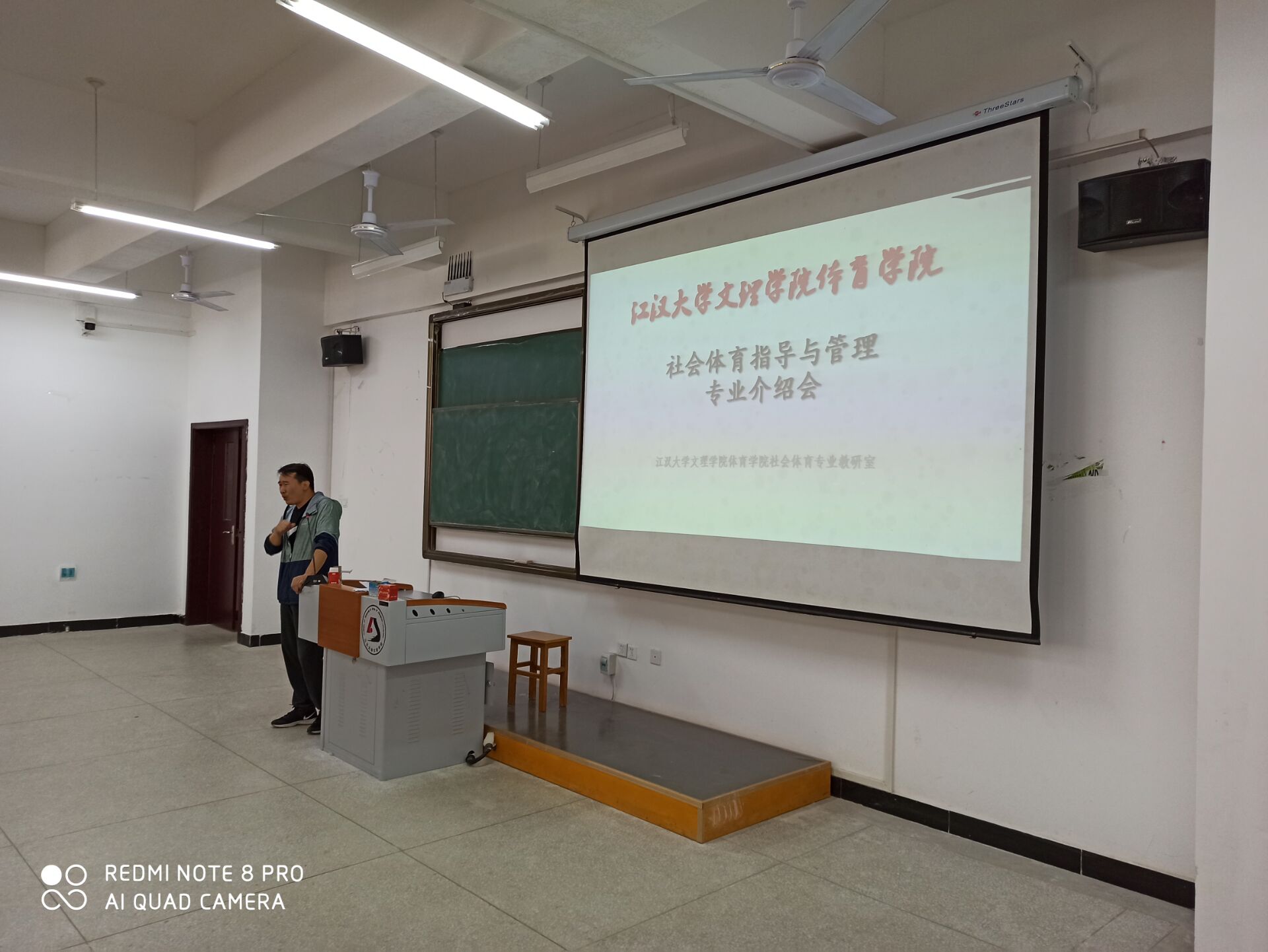 2019年9月20日中午,体育学院2019级新生入学专业介绍会在5号教学楼126教室隆重举行。体育学院社会体育专业主任金海波教授以“社体专业领域引领”为题为2019级新生作专题报告,报告由学院分团委书记黄小斐主持。学院综合办公室主任杨洁、2019级辅导员程献聆听了报告。