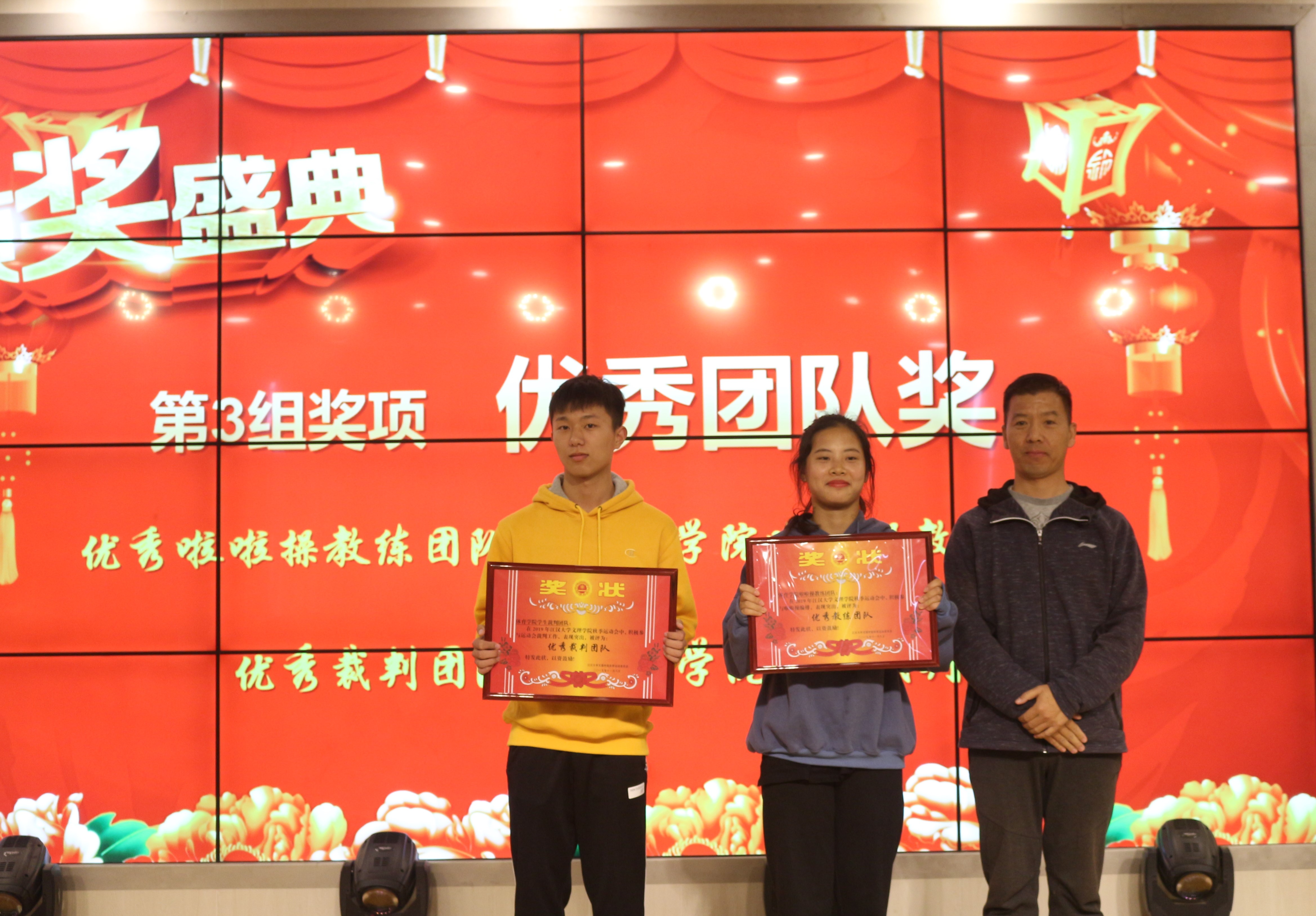 随后,最激动人心的颁奖仪式开始了。程献老师,冯岩老师,程锡森院长,曹灵海老师分别给优秀教练员,优秀裁判员,优秀团队,优秀编导老师颁奖表彰并合影留念。借此感谢他们为此次运动会的辛勤付出。