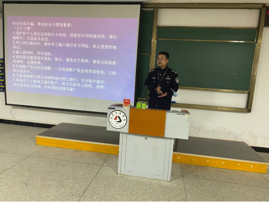 会议开始,武湖派出所常警官给同学们介绍了诈骗中的一些常见形式和诈骗手段,举例了每年来被骗的实例,包括刷单、假冒客服诈骗、冒充公检法诈骗、网络婚恋诈骗、投资理财类诈骗等等,被骗钱财金额量大,被骗人数多,造成不良影响和后果。