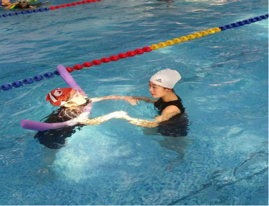 在游泳培训中,我说的技术要领孩子们不是很理解,毕竟他们还小,领悟能力相对较弱。比如,蛙泳的呼吸练习,在这里有很多小孩不敢把头埋进水里,怕水心理很严重。所以不能用在学校学到的专业用语来表述,要用比较形象生动的话语和肢体动作来表达,这样孩子们就能够快速接受。