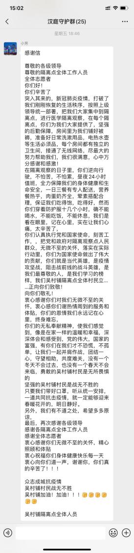 虽然这份工作只有短短的一个月,但脑海中的回忆扔在蔓延,令许笑扬印象最深的是有一位七十多岁的老太太,很认真地听她说话,又很慈祥的一直在感谢她,当时她就觉得心里就暖洋洋的。还有一位隔离人员亲自手写了一封感谢信,后来又发了电子版的感谢信,这让他们这些志愿者们都很感动。这是大家对她的认可与肯定,这段短暂的经历,已经转化为一笔无形的财富。