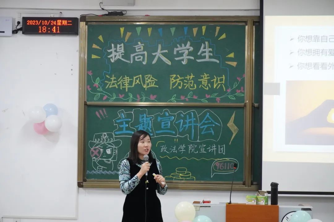 2023年10月24日晚18:20,由武汉文理学院学生处主办政法学院承办的“提高大学生法律风险防范意识”主题宣讲会在5-126教室举办,莅临本次宣讲会的嘉宾有:政法学院党总支书记张晓、法学教师江莲、政法学院分团委书记牛梦以及各年级辅导员。